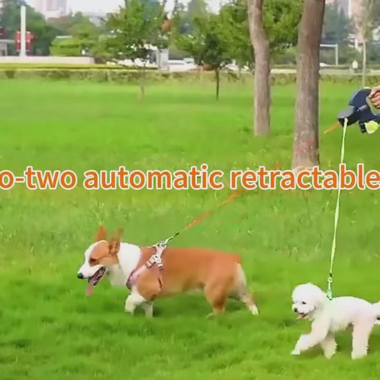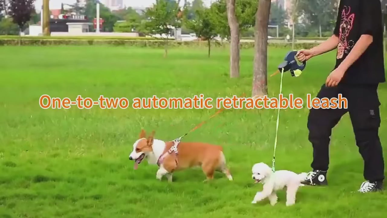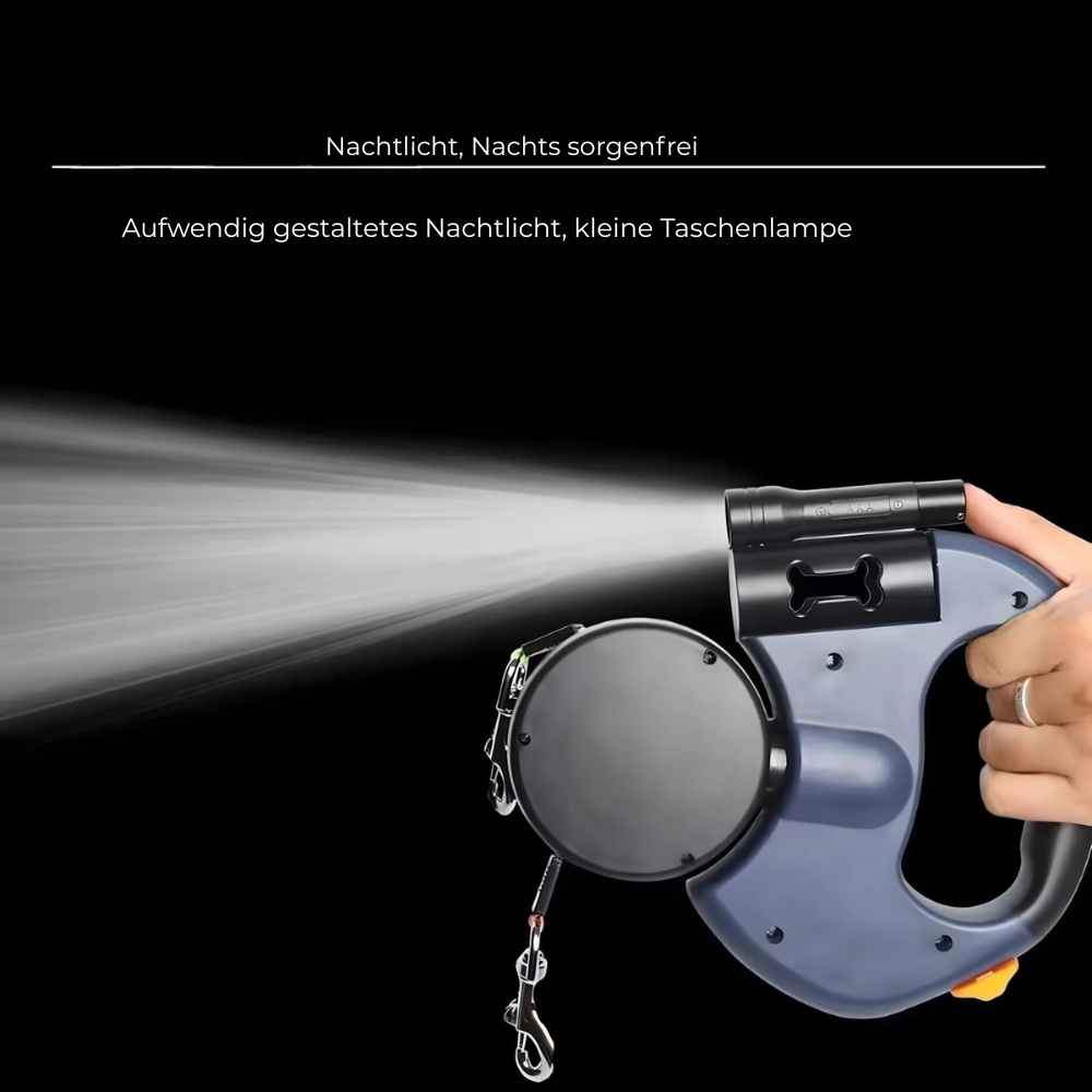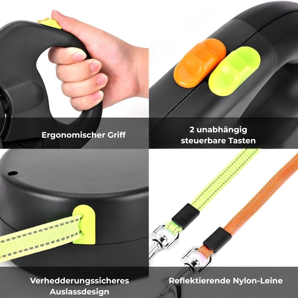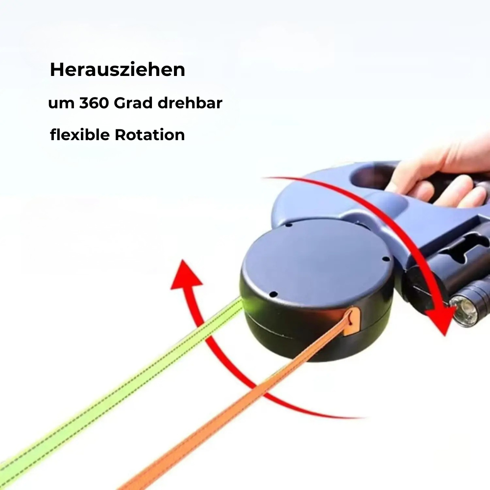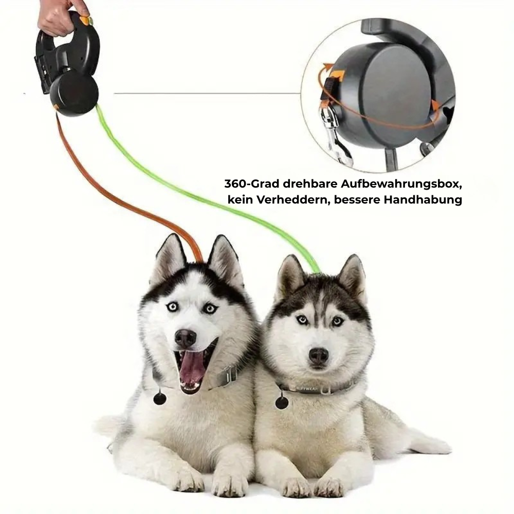 Die drehbare Aufbewahrungsbox hält beide Leinen automatisch getrennt, damit nichts verknotet und du immer volle Kontrolle behältst, selbst bei zwei kräftigen Hunden.